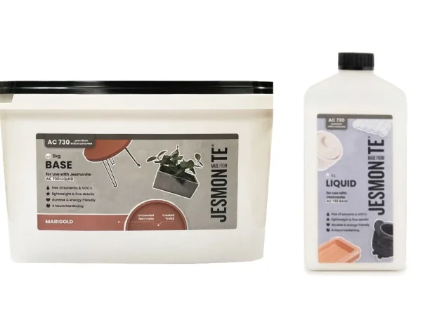 Jesmonite AC730 set Marigold je brzovezujući akrilni polimer, modifikovani kompozitni materijal na bazi cementa. Sadrži 2 komponente - tečnost i prah-bazu. Nakon stvrdnjavanja i površinske obrade, oponaša izgled popularnog krečnjaka boje meda iz britanskog Cotsvoldsa. Otporan je na UV zračenje i možete ga koristiti na otvorenom. Proizvodi su vatrootporni, lagani i otporni na udarce i habanje. Za impregnaciju premazati Sealerom.