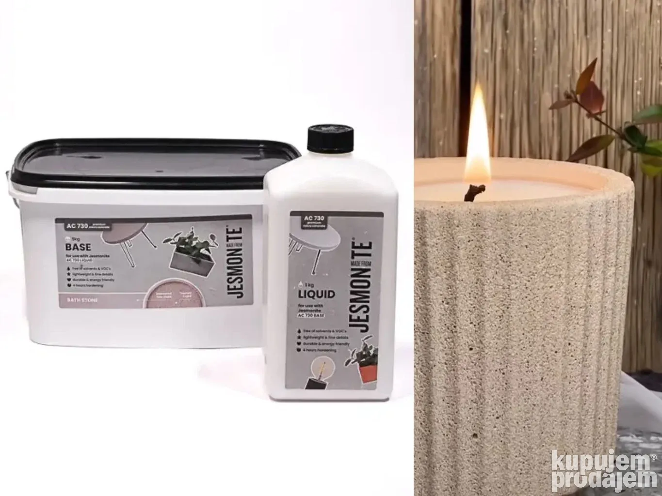 Jesmonite AC730 set Bath Stone je brzovezujući akrilni polimer, modifikovani kompozitni materijal na bazi cementa. Sadrži 2 komponente - tečnost i prah-bazu. Nakon stvrdnjavanja i površinske obrade, oponaša izgled Oolitskog krečnjaka boje meda. Otporan je na UV zračenje i možete ga koristiti na otvorenom. Proizvodi su vatrootporni, lagani i otporni na udarce i habanje. Za impregnaciju premazati Sealerom.