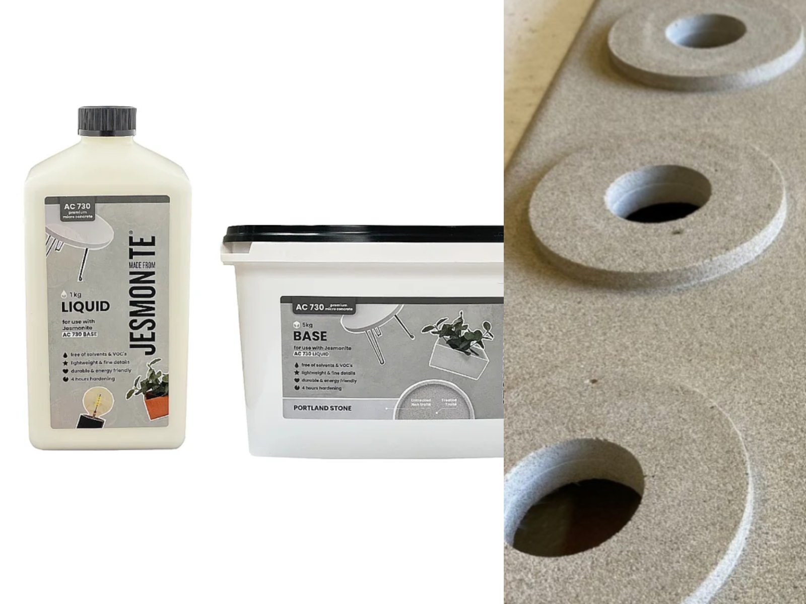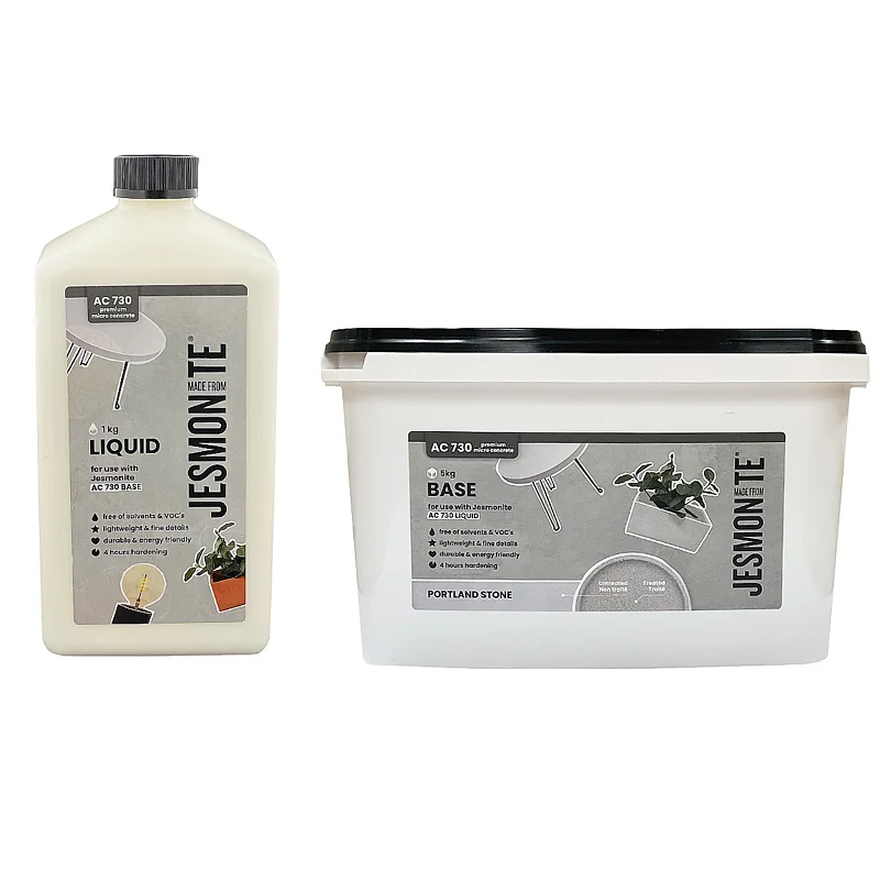 Jesmonite AC730 set Portland stone je brzovezujući akrilni polimer, modifikovani kompozitni materijal na bazi cementa. Sadrži 2 komponente - tečnost i prah-bazu. Nakon stvrdnjavanja i površinske obrade, oponaša izgled portlandskog kamena. Otporan je na UV zračenje i možete ga koristiti na otvorenom. Proizvodi su vatrootporni, lagani i otporni na udarce i habanje. Za impregnaciju premazati Sealerom.