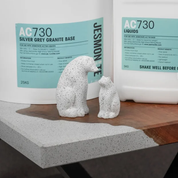 Jesmonite AC730 set Silver Grey Granite je brzovezujući akrilni polimer, modifikovani kompozitni materijal na bazi cementa. Sadrži 2 komponente - tečnost i prah-bazu. Nakon stvrdnjavanja i površinske obrade, oponaša izgled svetlo sivog granita. Otporan je na UV zračenje i možete ga koristiti na otvorenom. Proizvodi su vatrootporni, lagani i otporni na udarce i habanje. Za impregnaciju premazati Sealerom.
