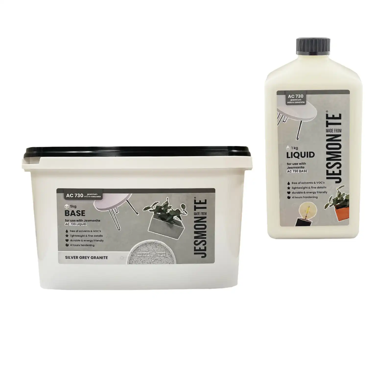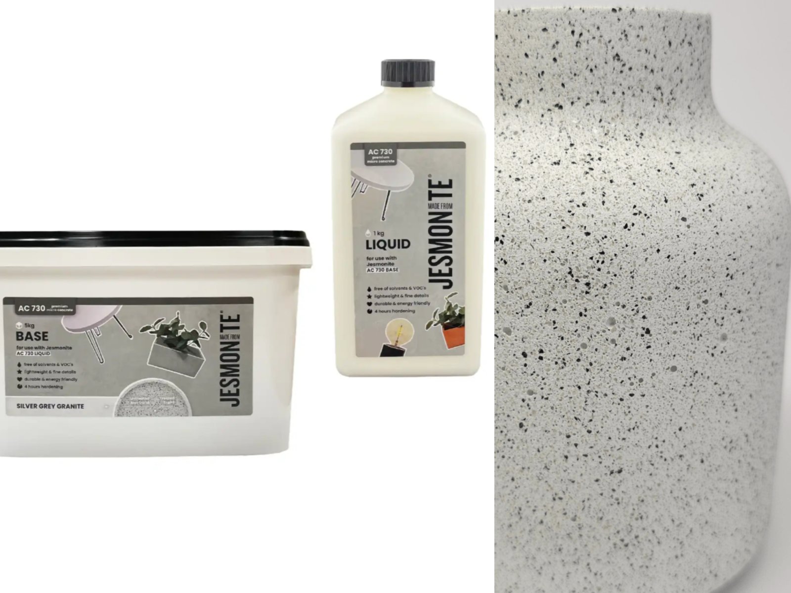 Jesmonite AC730 set Silver Grey Granite je brzovezujući akrilni polimer, modifikovani kompozitni materijal na bazi cementa. Sadrži 2 komponente - tečnost i prah-bazu. Nakon stvrdnjavanja i površinske obrade, oponaša izgled svetlo sivog granita. Otporan je na UV zračenje i možete ga koristiti na otvorenom. Proizvodi su vatrootporni, lagani i otporni na udarce i habanje. Za impregnaciju premazati Sealerom.